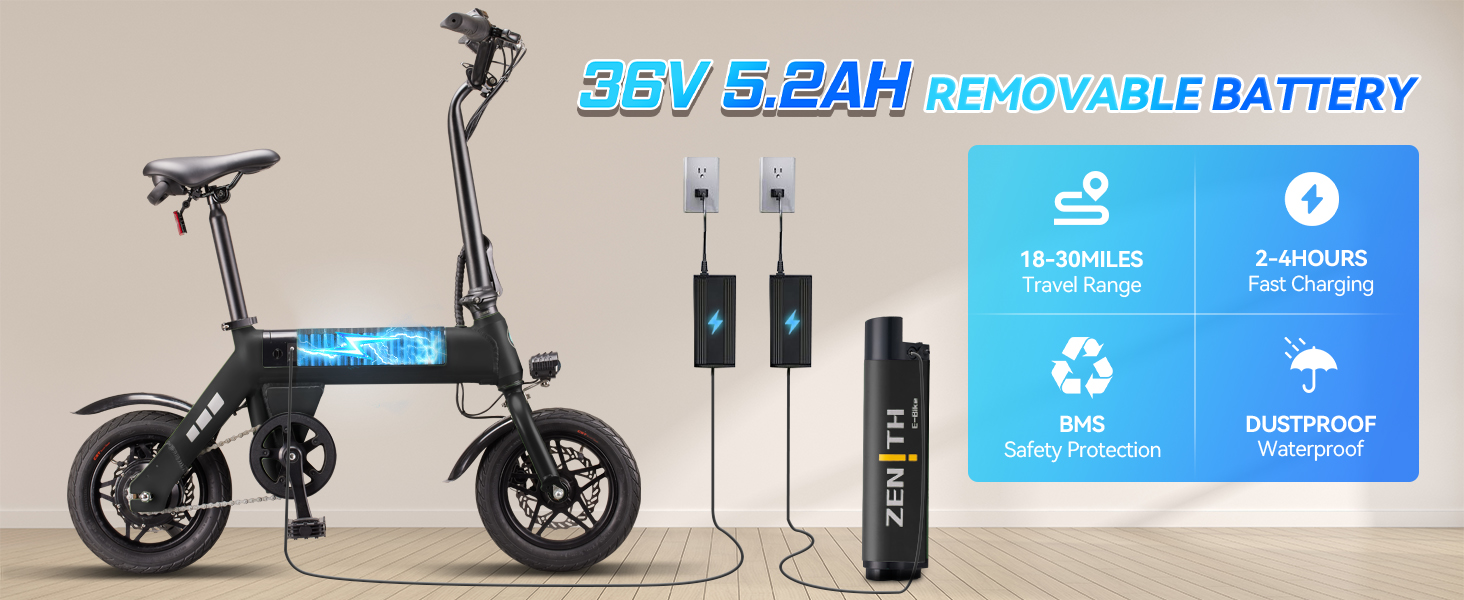 The 36V battery provides up to 18–30 miles per charge and takes only 5–6 hours to recharge. The removable design makes charging at home or office easy.